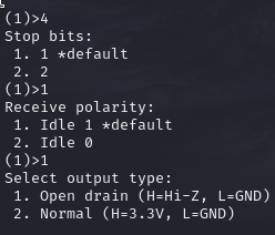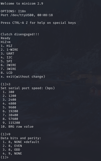With the Bus Pirate powered and connected to the computer and the modem off we need to finalize our settings. Run minicom and bring up the menu by hitting ‘m’ key. There will be 6 options needed to be set for UART. (The settings are different for each protocol)