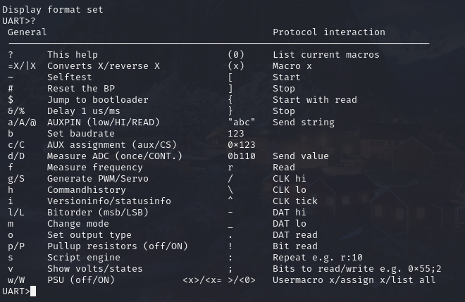 To run the program type minicom in the terminal, if configured correctly any keystroke will cause the led on the Bus Pirate to blink. typing ? in the minicom window will bring up the help menu.